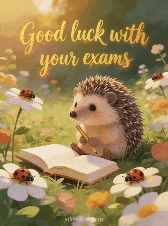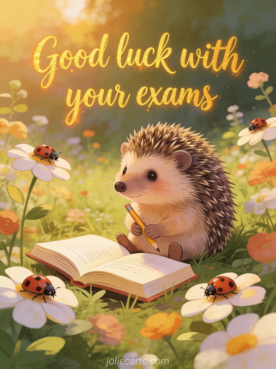 Encourage someone during exam season with this adorable card featuring a hedgehog holding a pencil next to an open book in a flower garden. Discover also a good luck studies card, a good luck exam card or a good luck animated card.
