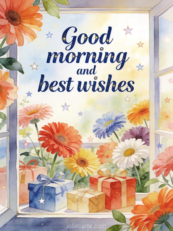 Send a festive good morning card with elegant deep blue watercolor lettering, bright gerbera daisies, wrapped gift boxes and floating star confetti in a window garden. Discover also a little message for good morning, a good morning message to her darling or a good morning message for my man.
