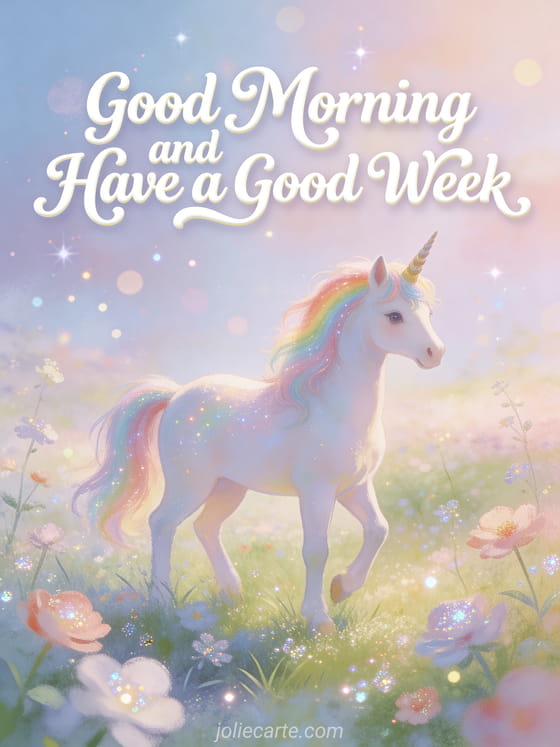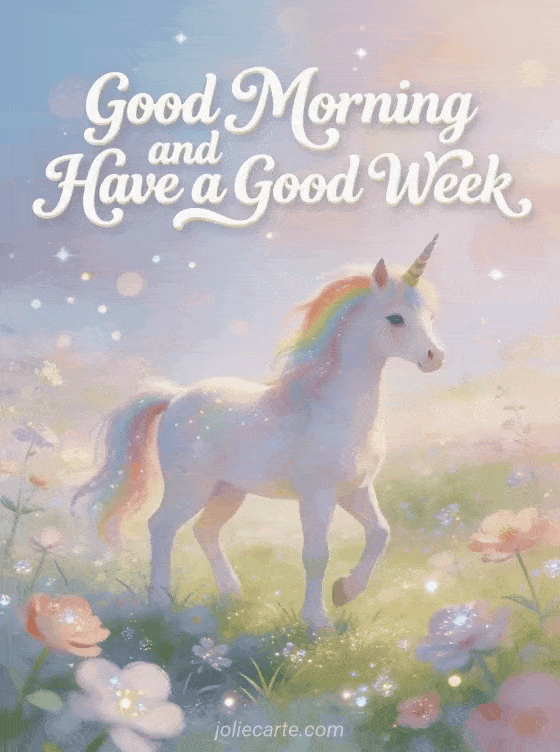 Share a touch of magic with this good morning and good week card featuring a dreamy unicorn in a sparkling meadow. Discover also a funny animated good week or a good week images card.