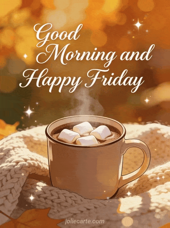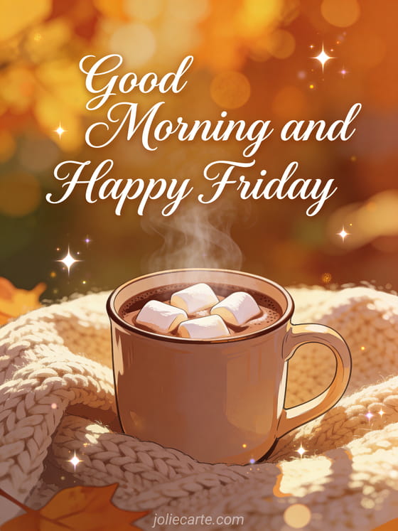 Start the weekend with this cozy Friday card featuring a steaming hot chocolate with marshmallows in warm autumn light. Discover also a funny good morning friday image or a beautiful friday day.