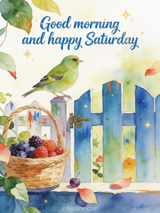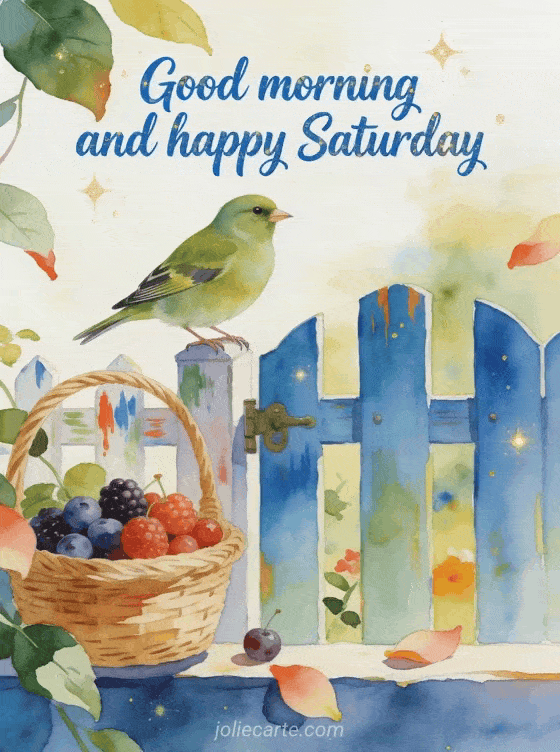 Send good morning and happy saturday gifs with fresh blue lettering, a greenfinch perched by a painted garden gate, a basket of ripe berries and leaves crossing the border. Discover also this happy saturday my friend image, this romantic happy Saturday image or these happy Saturday great weekend images.