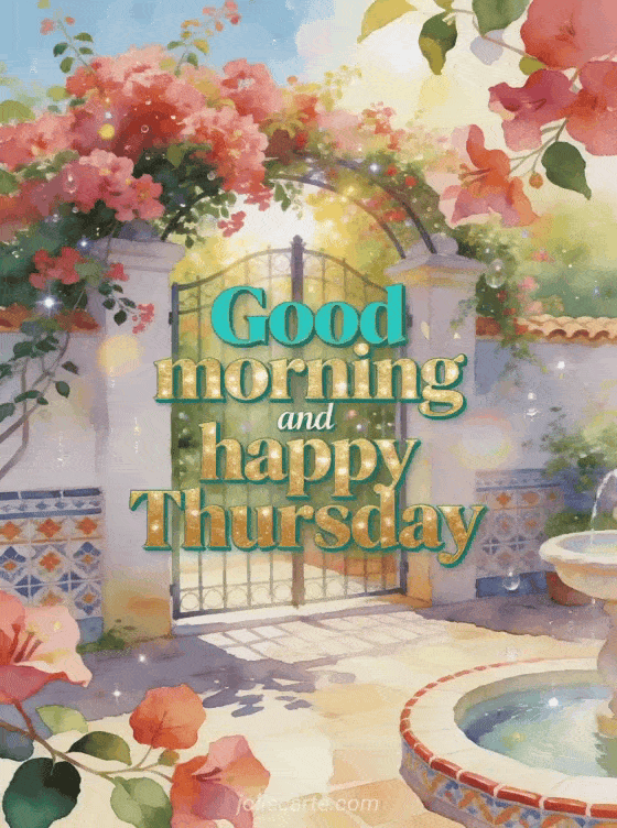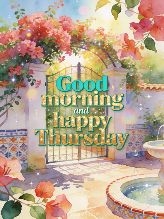 Share a sunny Thursday greeting with turquoise lettering, golden shimmer, a garden gate covered in bougainvillea, patterned tiles, a small fountain basin, sparkling droplets, and Mediterranean colors. You can also send a happy Thursday coffee gif, a happy Thursday friends image, or happy thursday morning images.