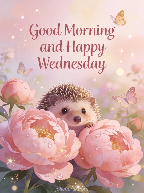 Wish someone a wonderful Wednesday with this enchanting card. A charming hedgehog peeks out from behind pink peonies with morning dew drops glistening on flower petals and butterflies fluttering around. Discover also a happy Wednesday have a nice day card or a happy Wednesday kisses card.