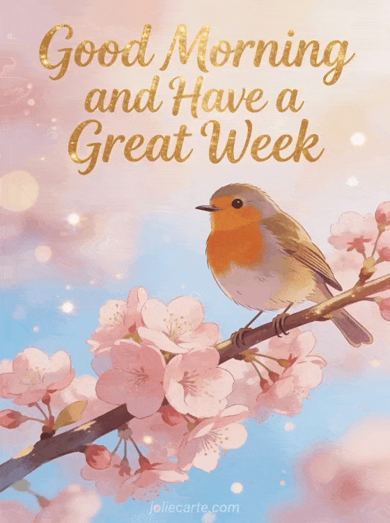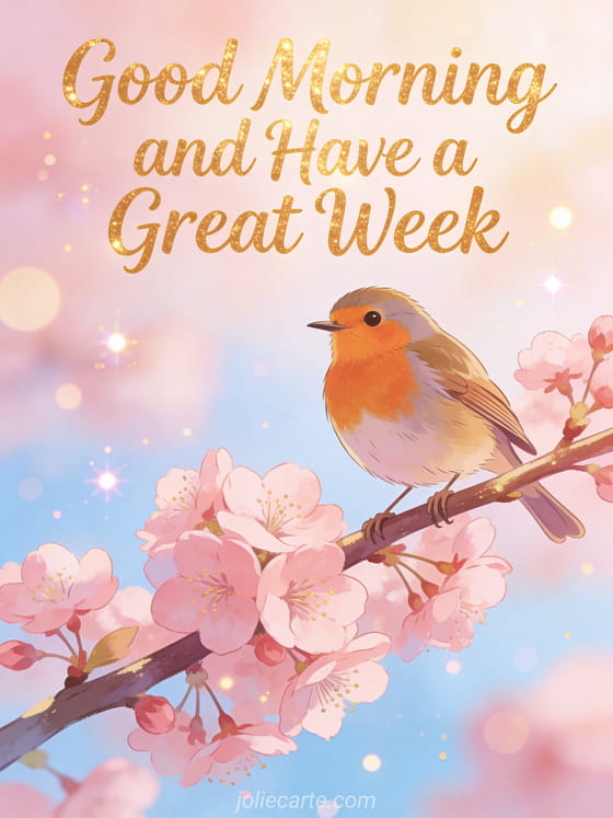 Start the week on a bright note for your loved ones with this warm card featuring a cheerful robin perched on a blooming cherry branch in soft morning light. Discover also a have a good week card or a have a good week and stay strong card.