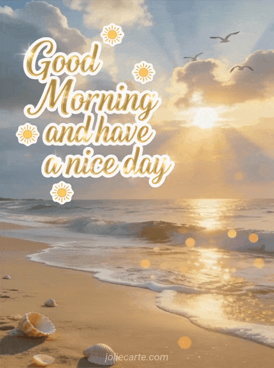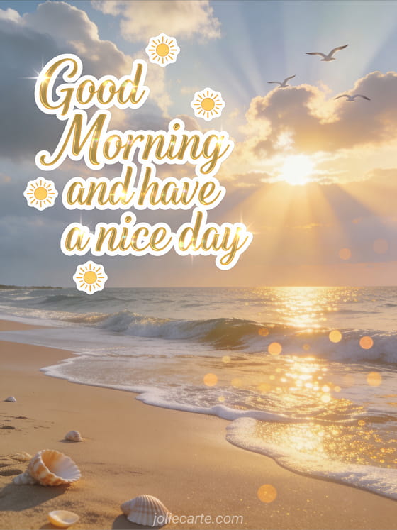 Start the day with this stunning card featuring a sandy beach at sunrise, gentle waves caressing the shore, spectacular sunbeams and golden bokeh on the water. Discover also a have a nice day card with kisses or a have a great day card.