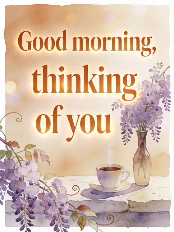 Share a gentle thought for someone with this watercolor card, featuring a slim vase of wisteria, curled leaves, and a steaming coffee cup on pale stone. Discover also good morning coffee image, morning coffee picture, or good morning with coffee animated gif.