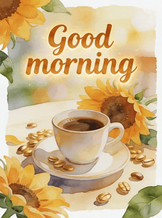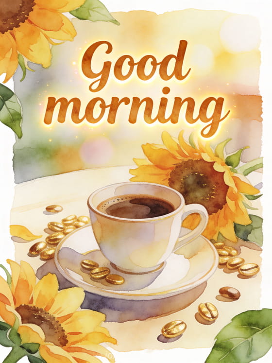 Share a cheerful good morning with caramel lettering, a small espresso cup on a saucer, sunflowers and golden coffee beans on a bright breakfast table. Discover also pretty good morning coffee image, good morning good morning coffee or beautiful good morning coffee image.
