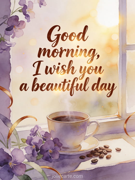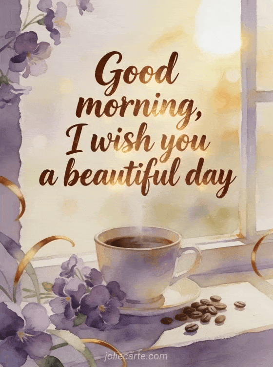 Share a soft good morning coffee message filled with warm light, violets and a peaceful start to the day. Discover also a good morning good coffee image, a good morning animated gif steaming coffee or a gif good morning coffee croissant.