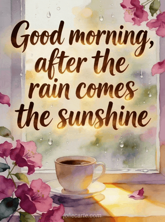 Share a hopeful morning thought with a coffee cup near a rain-speckled window, bright fuchsia blossoms and a warm sunbeam across the table. You can also send good morning coffee tenderness, a sparkling good morning coffee gif or good morning my darling coffee.