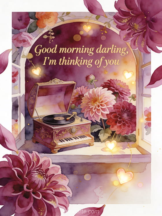 Send a romantic card with an ornate music box open beside rich dahlias and glowing heart-shaped lights in a bright floral alcove. Discover also some pretty good morning cards, an example of a good morning message or a touching good morning message.