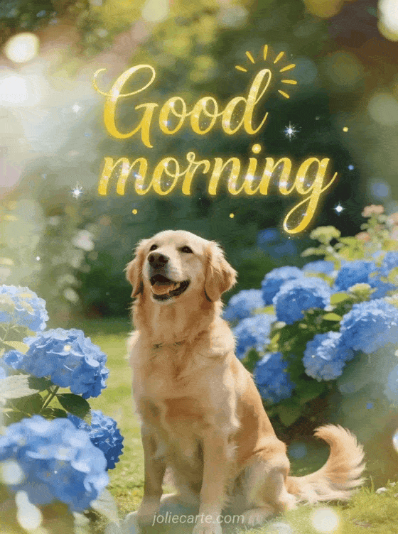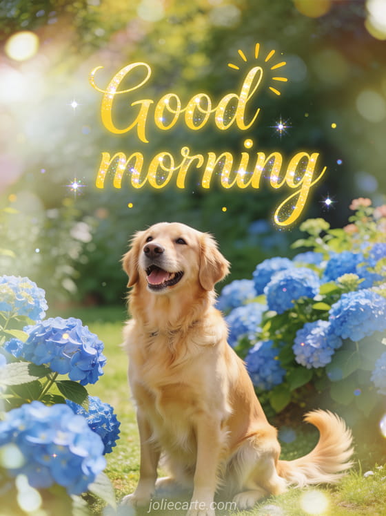 Share a bright good morning greeting with a happy golden retriever in a sunny garden of blue hydrangeas. Discover also a beautiful image of happy friday, a happy Friday sun gif or a happy Friday image with flowers.