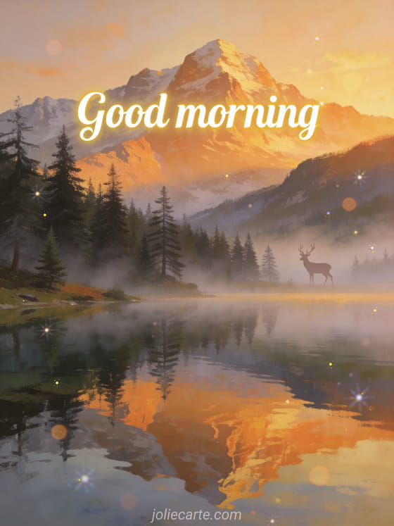 Share a peaceful good morning greeting with elegant white script, golden glow, a majestic mountain sunrise reflected in a clear lake, misty pine forest and a graceful deer in the distance. Discover also happy friday images, a happy friday humor card or a happy friday coffee image.