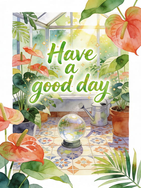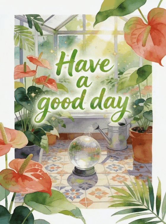 Send a welcoming good day message with green watercolor lettering, anthurium flowers, a glass watering globe, patterned tiles and tropical leaves in a morning greenhouse. Discover also a good day rain gif, a good day kisses animated image or a good morning good day animated gif animated gif.