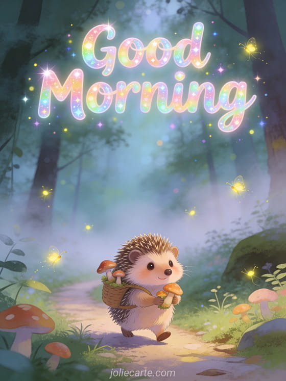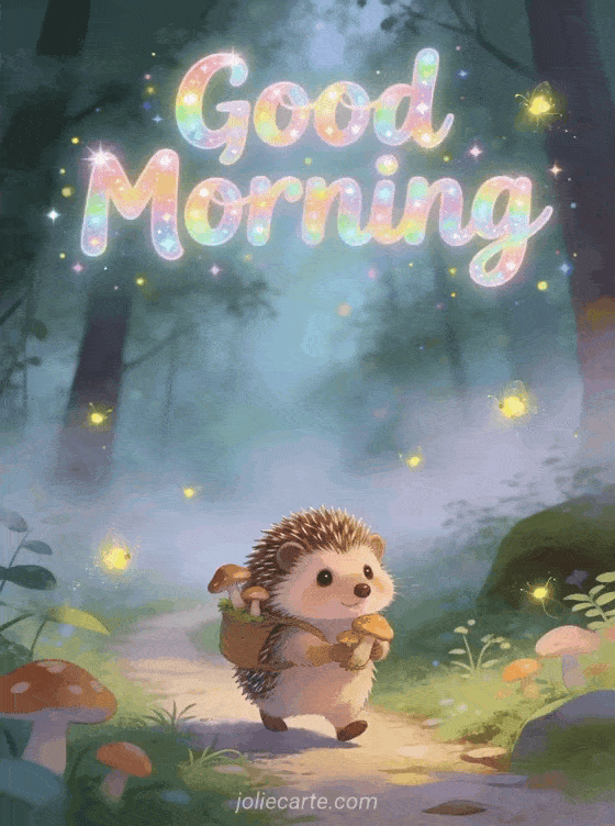 Send a magical good morning gif with this free card featuring a cute hedgehog carrying mushrooms through an enchanted forest. Discover also a good morning my love or good morning images.