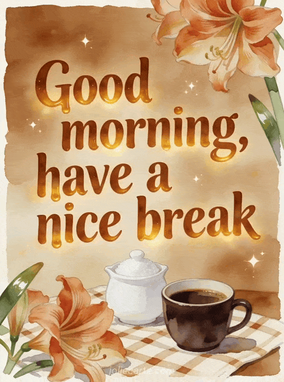 Wish a nice break with a white sugar bowl, a dark coffee cup, bold amaryllis blossoms and a checkered cloth in cozy amber watercolor light. Discover also good morning sweetheart coffee, good morning coffee coffee or good morning coffee gifs.