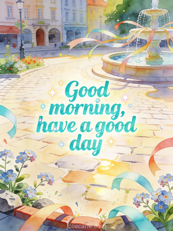 Share good morning, have a good day with a bright watercolor town square fountain, fluttering ribbons, aubrieta blooms, and sunlit cobblestones. You can also send a good day too gif, a good day fairy gif, or a good day kisses animated gif.