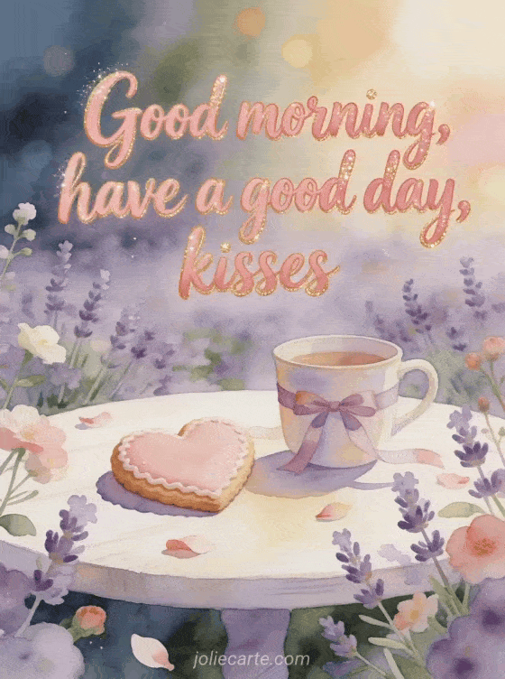 Share a good morning and have a good day wish with a lavender garden table, a heart shaped sugar cookie, a ribboned cup and delicate flower sprigs. Discover also have a good day animated gif good morning have a good day, good day snow gif or good day image with kisses.