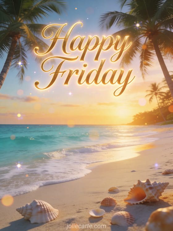 Share a relaxing happy Friday greeting with a tropical beach, turquoise water, white sand, palm trees and seashells in warm sunset light. Discover also funny image funny image happy Friday humor, a happy friday heart or good morning beautiful Friday day.