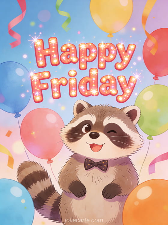Share a joyful happy Friday greeting with an adorable raccoon wearing a tiny bow tie, surrounded by colorful balloons and festive streamers. Discover also landscape happy friday, an animated happy Friday card or a happy friday everyone gif.