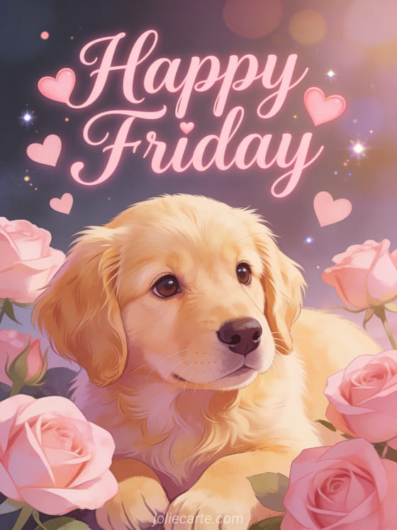 Send a tender happy Friday greeting with an adorable golden retriever puppy and pink roses. A romantic and heartwarming way to wish someone a wonderful Friday. Discover also a zen happy Friday card or a happy Friday and good weekend card.