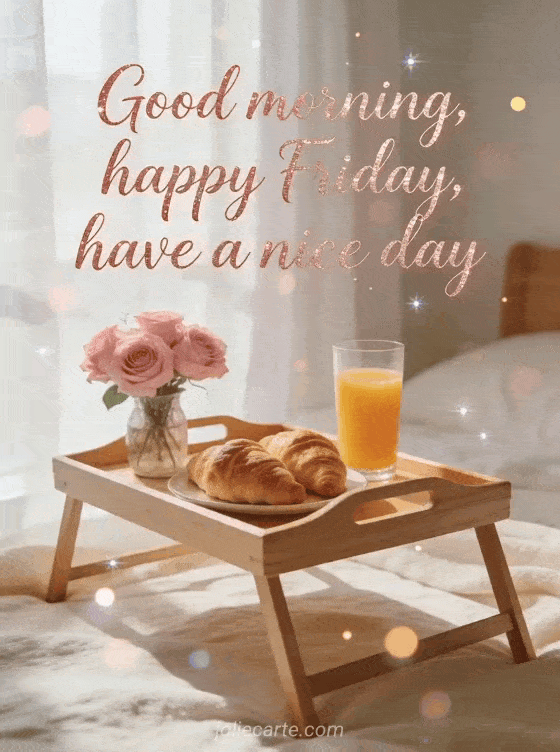 Share a warm good morning and happy Friday greeting with this free card and brighten the day with an elegant breakfast mood. You can also discover happy friday cat, good morning its friday gif or friday kisses gifs.