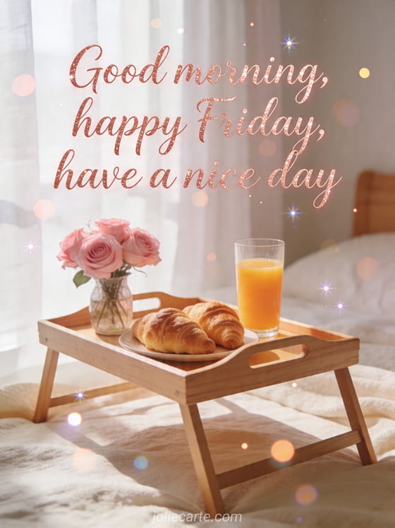 Good morning, happy Friday, have a nice day an elegant friday morning wish with a lovely breakfast scene