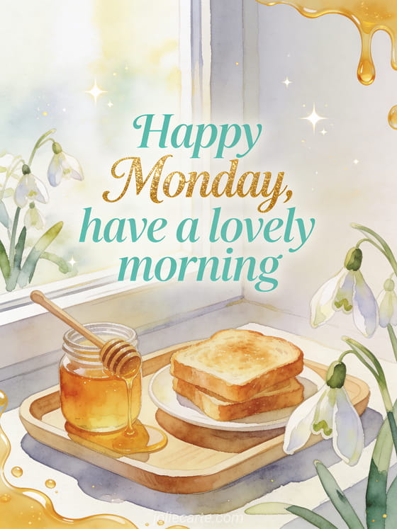 Send a gentle happy Monday message with honey, warm toast and snowdrop flowers in clear morning light. Discover also a happy monday woman gif, a good morning happy monday image or a friendship excellent happy monday and good week.