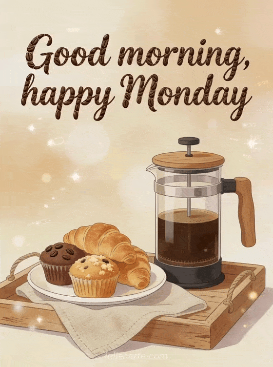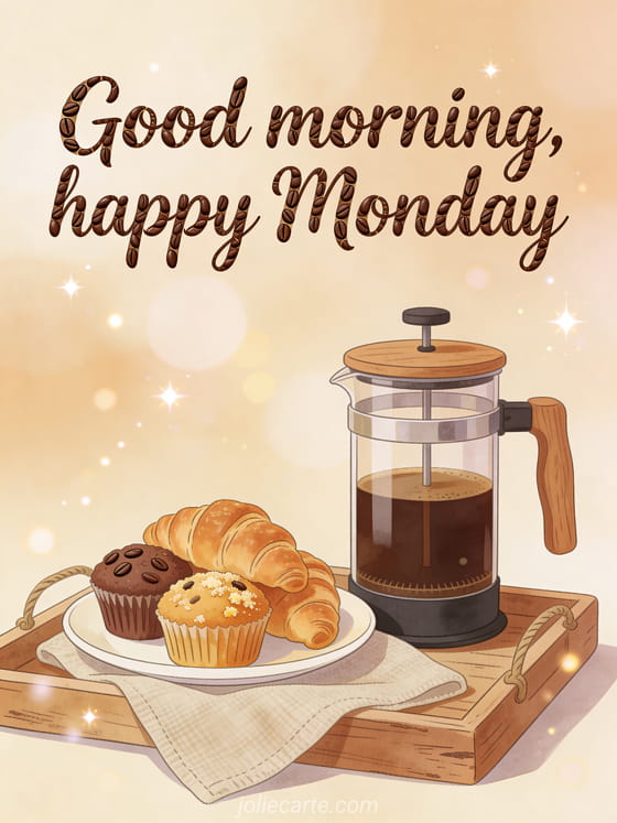 Send a warm good morning happy Monday greeting with bistro-style lettering, French press coffee and fresh pastries on a breakfast tray. Discover also a happy monday have a good week gif, happy Monday coffee image or happy monday good morning have a good week.
