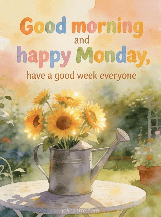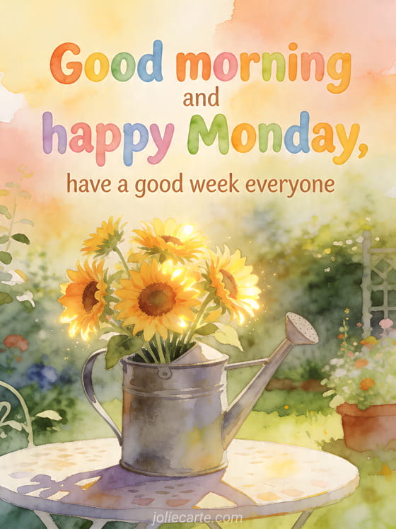 Send a cheerful Monday greeting with this bright card showing a bouquet of sunflowers in a watering can on a garden table. You can also discover coffee happy monday images, happy monday photo or image to say happy monday.