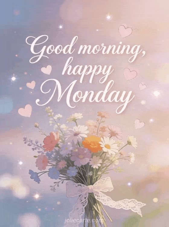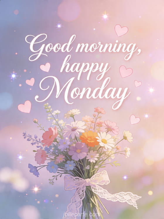 Send a sweet Good morning, happy Monday card with a bouquet of wildflowers and lace ribbon for a loving start to the week. Discover also good morning monday good start of the week, funny happy monday and happy monday morning.