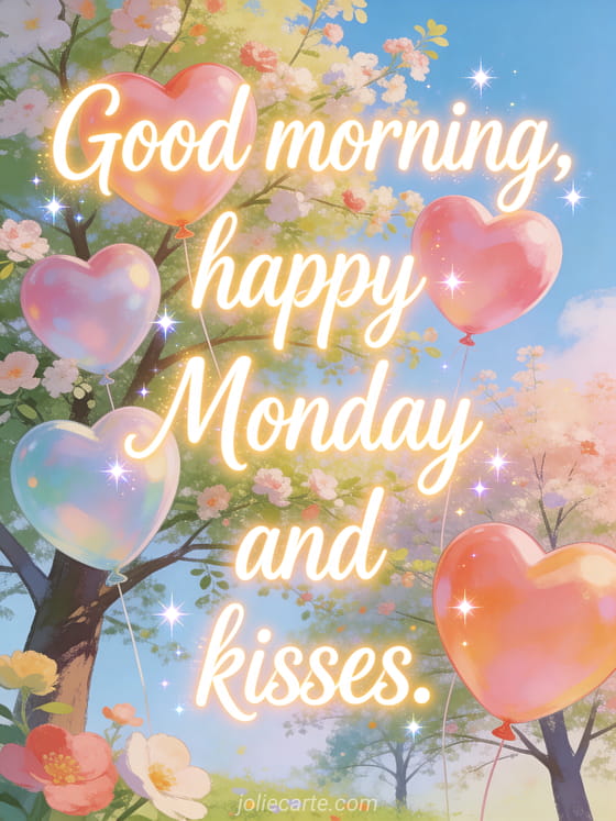 Send good morning, happy Monday and kisses with heart-shaped balloons drifting above spring trees. Discover also happy sunny Monday gif, monday kisses images or funny happy Monday humor.