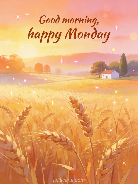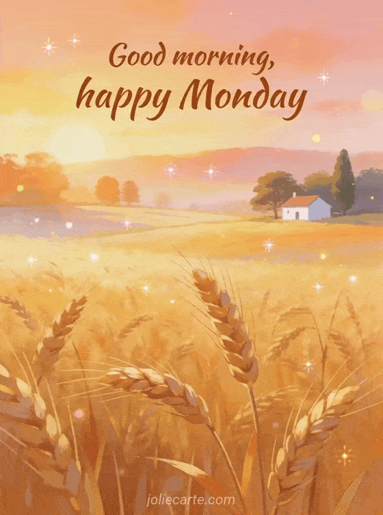 Send a gentle Good morning, happy Monday card with golden wheat fields at sunrise to begin the week calmly. Discover also happy monday image, happy monday funny and happy monday and good week.
