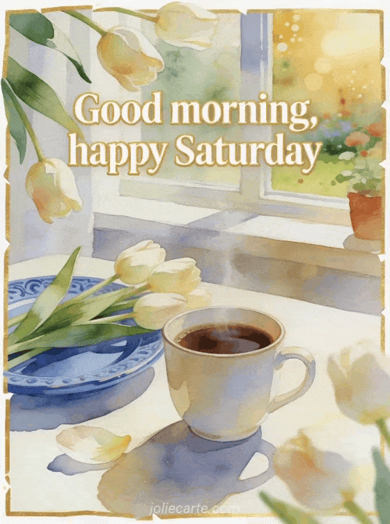 Start the weekend with a warm good morning and happy Saturday greeting in crisp white lettering with a golden outline. This free card shows a cozy breakfast nook, a steaming coffee cup, fresh tulips and a blue saucer near a sunny window garden. Discover also a happy Saturday animated gif card, a very happy saturday gif card or free happy Saturday and good weekend images.
