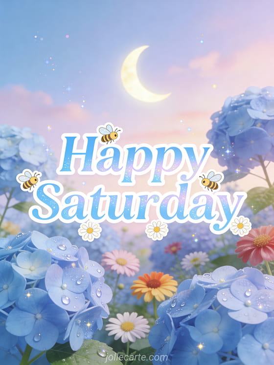 Send a delicate happy Saturday with blue hydrangeas, colorful zinnias, joyful bees, sparkling dew and a glowing crescent moon in a twilight sky. Discover also happy saturday stay warm, good morning good day happy Saturday or happy saturday kisses image.
