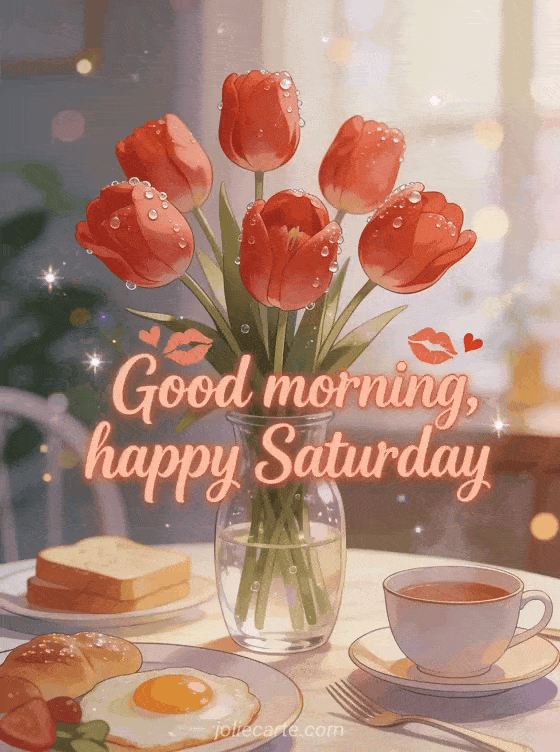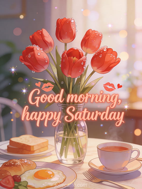 Share good morning happy saturday kisses with red tulips in a glass vase covered in morning dew, set in a romantic breakfast scene. Send more Saturday joy with landscape happy Saturday landscape, funny happy saturday or happy Saturday gifs.