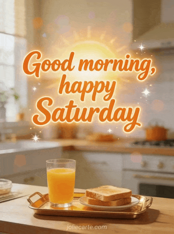 Share good morning happy saturday with a breakfast tray of fresh orange juice and toast in a bright morning kitchen scene. Start the weekend with salam aleykoum happy Saturday, happy Saturday coffee gif or gifs happy saturday.