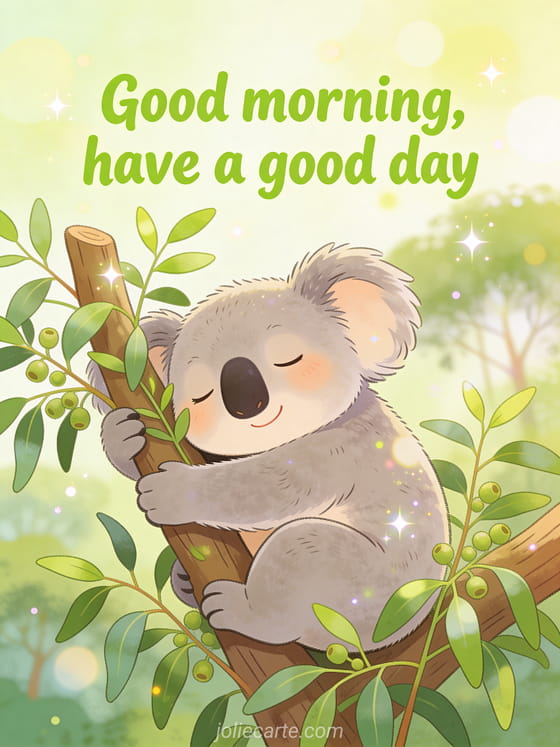 Share a gentle good morning greeting with a cute koala hugging a eucalyptus branch, a sleepy smile, and relaxed weekend energy. Discover also cold happy Sunday images or good morning happy Sunday gif.