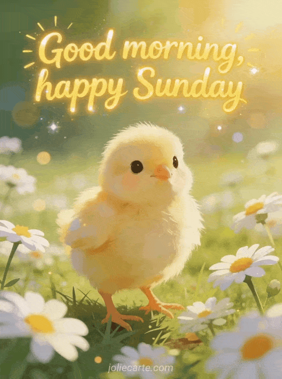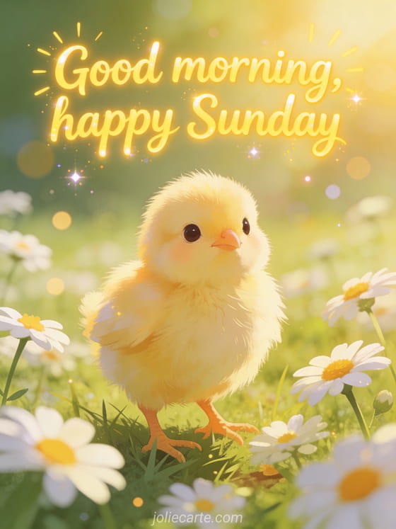 Share a good morning happy Sunday gif with cheerful yellow lettering, sunshine effect, a cute fluffy baby chick standing in daisies and a fresh spring morning atmosphere. Discover also good morning happy sunday card or happy sunny Sunday kisses.
