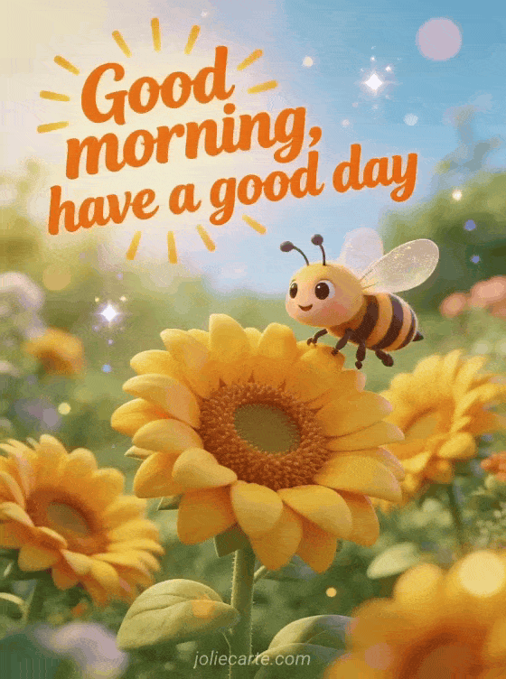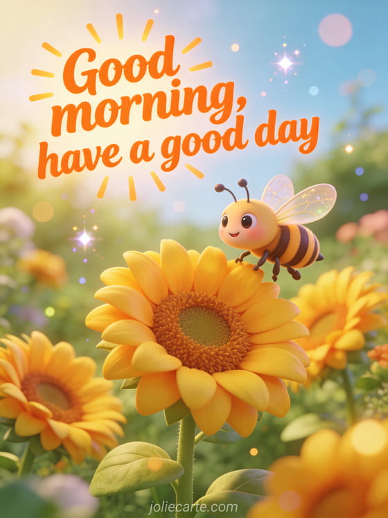 Share good morning happy Sunday good day with happy orange lettering, sunshine rays, a cute cartoon bee buzzing among bright yellow sunflowers and a joyful summer garden scene. Discover also good morning happy Sunday and good day or cold happy Sunday images.