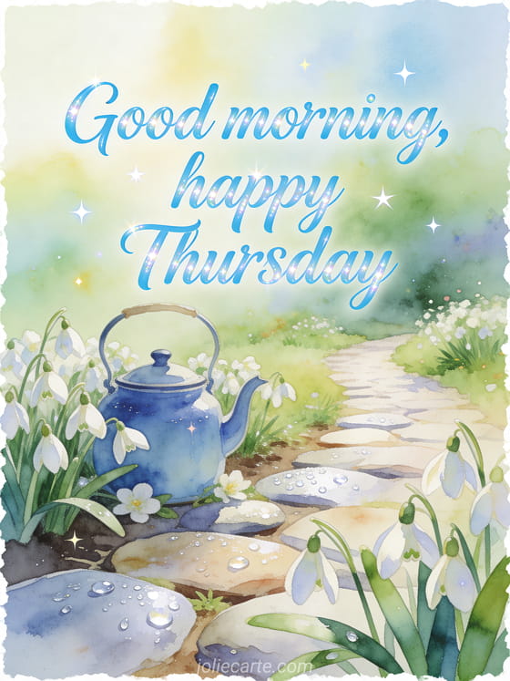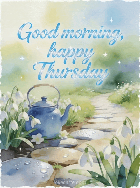 Share a fresh good morning and happy Thursday card with snowdrop blooms, a blue enamel kettle, dewy stones and a bright garden path. Discover also happy thursday gifs, good morning and happy Thursday image or happy Thursday coffee gif.