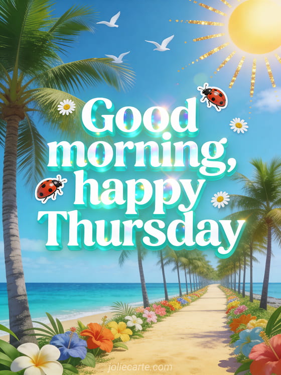Send a bright good morning and happy Thursday greeting with white lettering, turquoise highlights, ladybugs, daisies, a palm-lined path along the azure sea, golden sand and tropical flowers under a radiant sun. You may also like this free happy thursday card, this wish a happy Thursday image or this have a good day thursday.