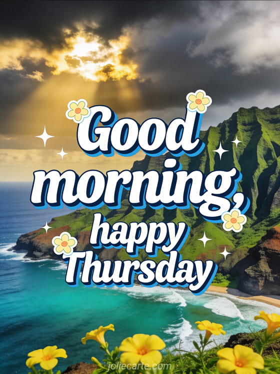 Send a good morning happy thursday sport image with sporty white letters, navy outlines, primrose stickers and shooting stars over the Na Pali Coast in Hawaii. Share an energizing weekday wish and discover also cards to wish a happy Thursday, beautiful animated happy Thursday images or good morning happy thursday.