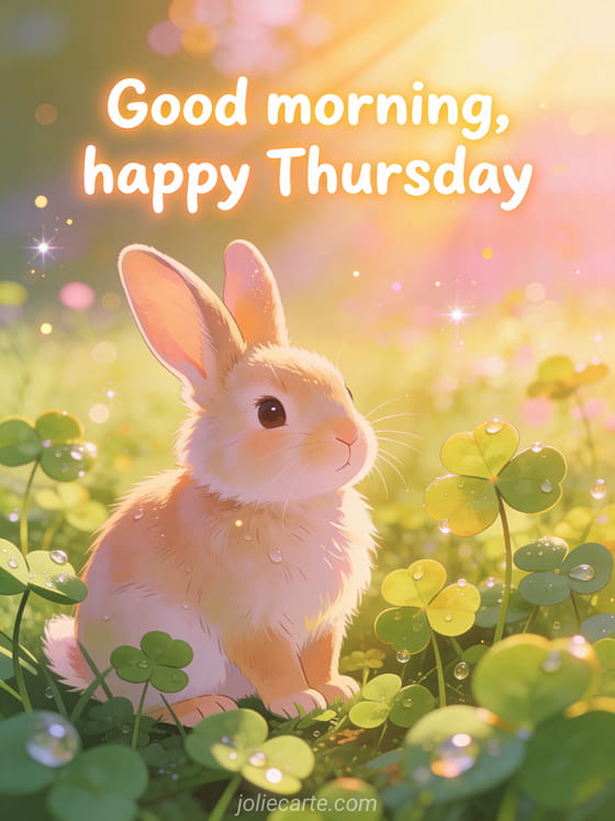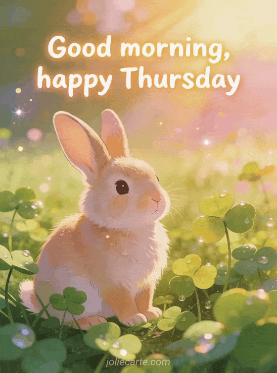 Send a cute good morning happy Thursday greeting with a bunny sitting in a meadow of clovers, morning dewdrops and a fresh spring glow. Discover also animated happy Thursday image, happy sunny Thursday images or beautiful happy Thursday kisses images.