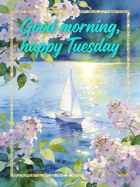 Start Tuesday with a sunny watercolor lake, a white sailboat, shimmering water, and phlox flowers spilling across the border. Continue the mood with happy Tuesday cards, good day happy Tuesday gif, or happy tuesday sparkling image.
