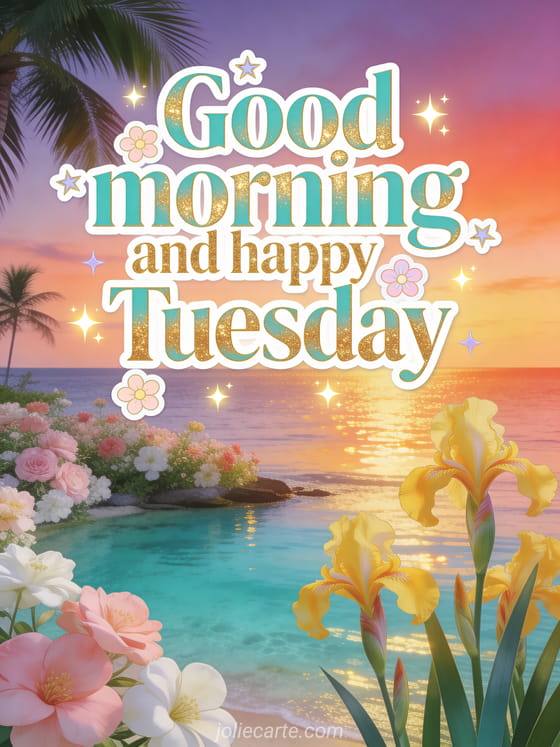 Send a soft good morning and happy Tuesday greeting with turquoise lettering, golden touches, pastel flowers, luminous stars, a turquoise bay at coral-violet twilight and bright yellow irises by the calm sea. You may also like this happy tuesday card, this funny happy Tuesday humor image or this happy tuesday image.