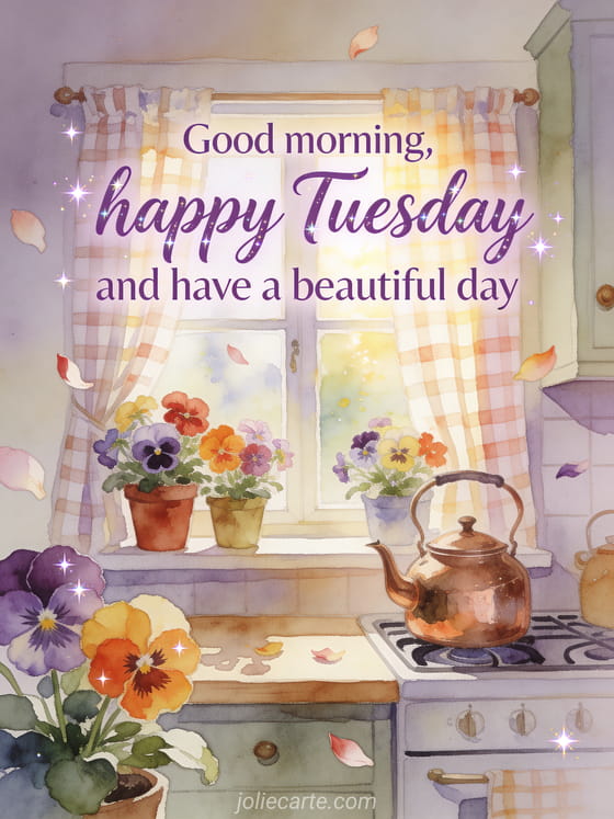 Share good morning happy Tuesday images with violet calligraphy, a cottage kitchen window, pansy flowers in colorful pots, a copper kettle and morning light across checked curtains. You can also send happy tuesday animated gif animated gif, happy Tuesday evening image or happy Tuesday with flowers image.
