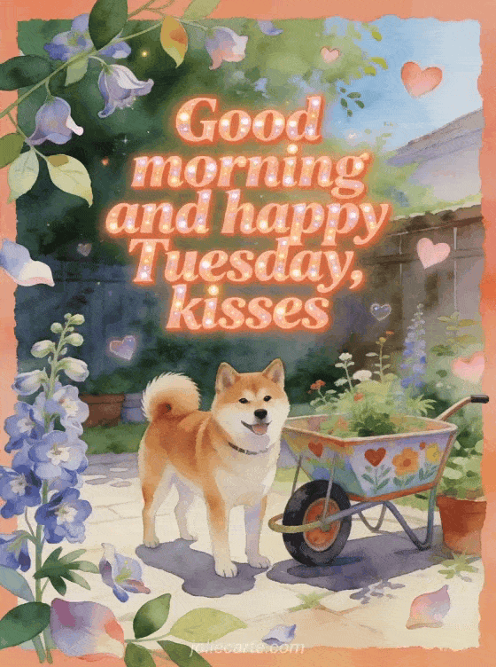 Share good morning, happy Tuesday and kisses with an akita inu beside a painted garden cart, delphinium petals and floating hearts. Discover also happy Tuesday images, happy Tuesday cats gif or good morning happy tuesday gif.