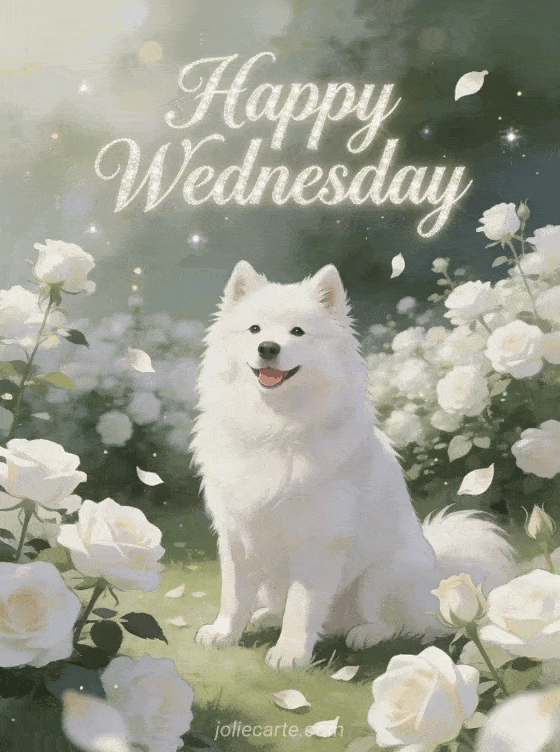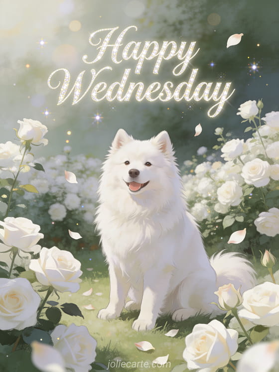 Send a graceful happy Wednesday greeting with a fluffy white samoyed sitting in a blooming garden of white roses. Discover also an animated dog kiss happy Wednesday gif, a happy Wednesday text or a free happy Wednesday image.
