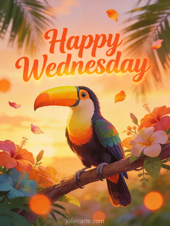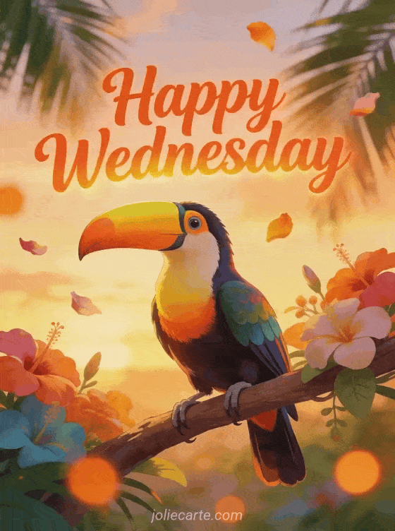 Send a bright Happy Wednesday card with a tropical touch to start the day warmly. Discover also wednesday wednesday image good morning and nice day, happy wednesday and nice day gif and happy wednesday message.