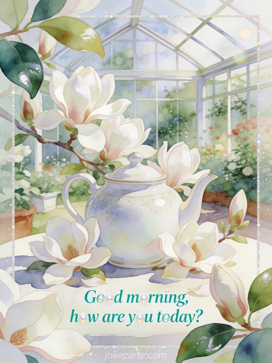 Send a polite and caring greeting with refined teal lettering, magnolia blossoms, a porcelain teapot and fresh conservatory garden light. Discover also how are you my love sms, card hey how are you or how are you my sweetheart.